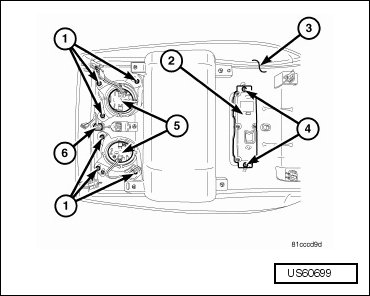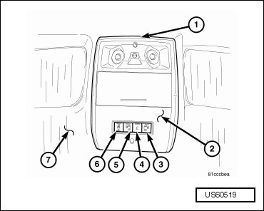 - Grasp the sides of the overhead console (2) and push straight up evenly to engage the four snap clips into the mounting bracket above the headliner (7).