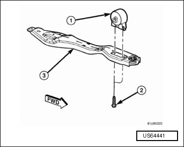 - Install front engine mount (1) on crossmember (3). Install mounting bolts (1) and tighten to 55 Nm (41 ft lbs).