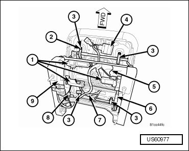 - Disconnect the wire harness connectors from the power seat motors (1) and the seat track position sensor (8) and remove the wire harness (7) from the bottom of the seat cushion frame and the seat riser (9).