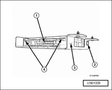 - Remove the push pin retainers (1) securing the module and bracket (4) to the seat pan (2).