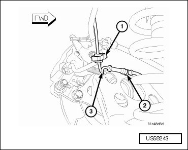 - Remove wheel speed sensor (3) from routing clips (1) along brake flex hose.