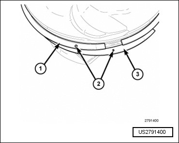 • The No. 1 (upper) piston ring (1) and No. 2 (intermediate) piston ring (3) have a different cross section. Install the rings with manufacturers I.D. mark (dot) (2) facing up, towards the top of the piston.