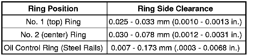 - Measure the ring side clearance as shown. Make sure the feeler gauge (1) fits snugly between the ring land and the ring. Replace any ring not within specification.