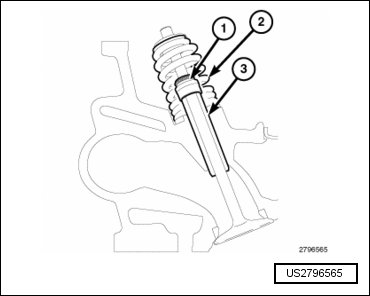 The valve stem oil seals (1) are made of elastomer over-molded steel in a non-integrated type guide mounted configuration. The seal is not held in place by the valve spring (2). The valve stem seals are not reusable if removed from the valve guides (3), they must be replaced. Always coat the valve seals with clean engine oil before installing the valves.