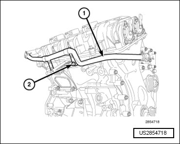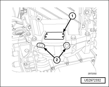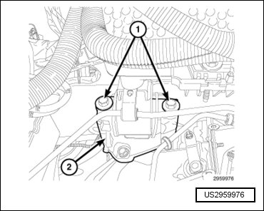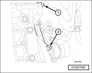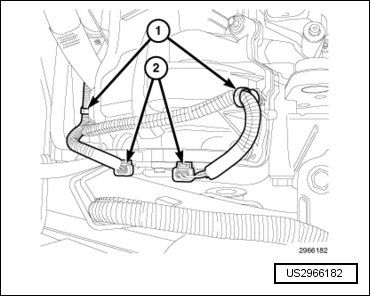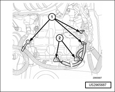 - Engage one wire harness retainer (2) to the engine block and one wire harness retainer (1) to the transmission mounting stud.