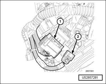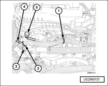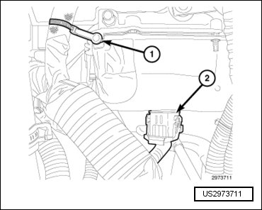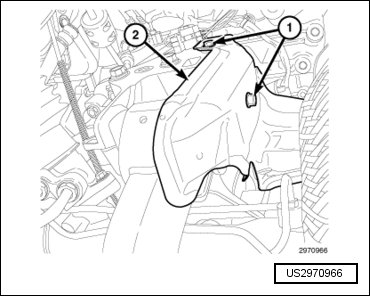 - Engage the wire harness retainer (2) to the upper intake manifold support bracket mounting stud.