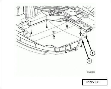 - Install the rear engine mount heat shield (2). Tighten bolts (1) to 14 Nm (124 in. lbs.).