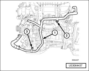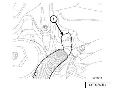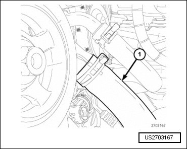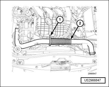 - Install the upper radiator hose (2) and engage the hose retainer (1) to the intake manifold.