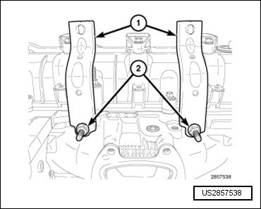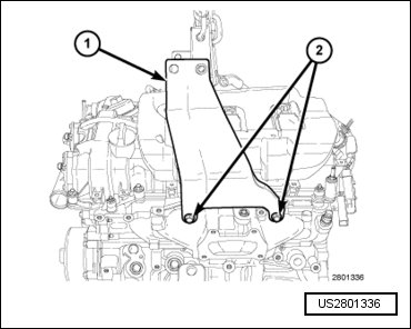 - Install the LH upper intake manifold support brackets (1). Loosely install the stud bolts (2).