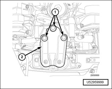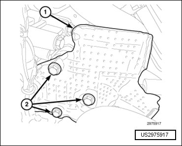 - Install the power steering pump heat shield (1) Tighten bolts (2) to 25 Nm (18 ft. lbs.).