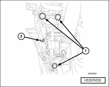 - If required, install the four transmission-to-engine lower bolts (2) and tighten to 70 Nm 52 ft. lbs.).
