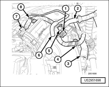 - Engage the ETC harness to the clip (8) on the throttle body. Engage the wire harness retainers (4 and 5) to the upper intake manifold near the MAP sensor and reposition the wire harness.