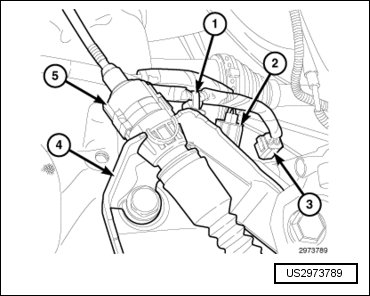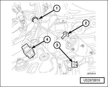 - Engage the downstream oxygen sensor connector (4) to the engine mount.