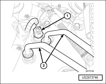 - Engage the wire harness retainer (2) to the power steering pump.