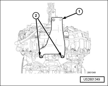 - Install the driver side engine lifting bracket (10242-1) (1) on the LH cylinder head with bolts (2) provided with the Engine Lifting Bracket. Tighten the bolts to 21 Nm (15 ft. lbs.).