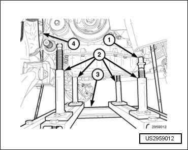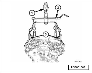 - Position a load-leveling lifting sling (2), such as OTC(R) 4305 Engine Load Leveler or equivalent, between the engine lifting brackets (3) and an engine hoist (1).