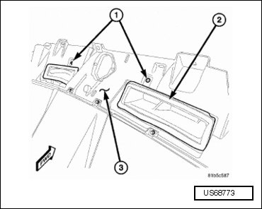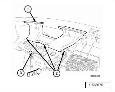 - Remove the two screws (1) that secure the defroster duct (2) to the top of the instrument panel cover (3).