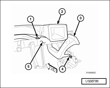 - Remove the screws (1 and 4) that secure the passenger side instrument panel duct (2) and the duct (3) to the instrument panel support (5).