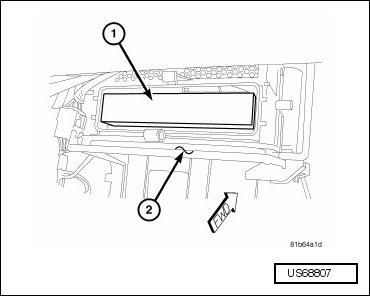 - Install the particulate air filter (1) into the filter opening in the HVAC air distribution housing (2). Insert the particulate air filter directly into the housing with the arrow on the filter pointing to the floor.