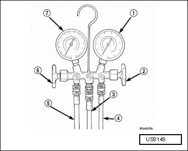 A manifold gauge set (1) may be needed with some recovery/recycling/charging equipment. The manifold gauge set should have manual shut off valves (2 and 6), or automatic back-flow valves located at the service port connector end of the manifold gauge set hoses (4 and 5). This will prevent refrigerant from being released into the atmosphere.
