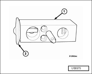 The A/C expansion valve controls the amount of refrigerant entering the A/C evaporator and is of a thermostatic expansion valve design. The A/C expansion valve consists of an aluminum H-valve type body (1) with an integral thermal sensor (2) and is located at the dash panel between the A/C refrigerant lines and the A/C evaporator.