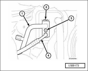 - Remove the nut (3) that secures the A/C suction line (1) and the A/C liquid line (4) to the A/C expansion valve (2).
