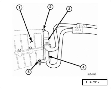 - Remove the screw (5) that secures the rear heater core tube bracket (4) to the rear HVAC housing (1).