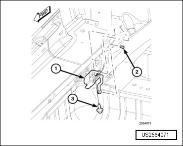 - Position the sensor (1), mounting bracket and link as a unit to the underside of the lower C-pillar reinforcement outboard of the left lower control arm for the rear axle.