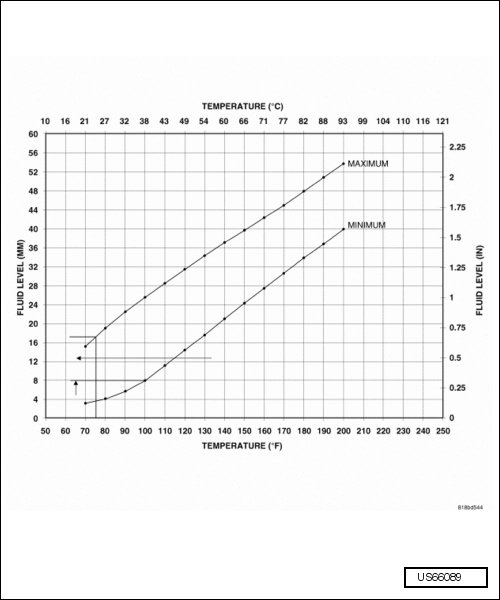 - The transmission transmission dipstick (9336A) has indicator marks every 10 mm. Determine the height of the fluid level on the dipstick and using that height, and the transmission fluid temperature as viewed with the scan too, and the transmission fluid graph above, determine if the transmission fluid level is correct.