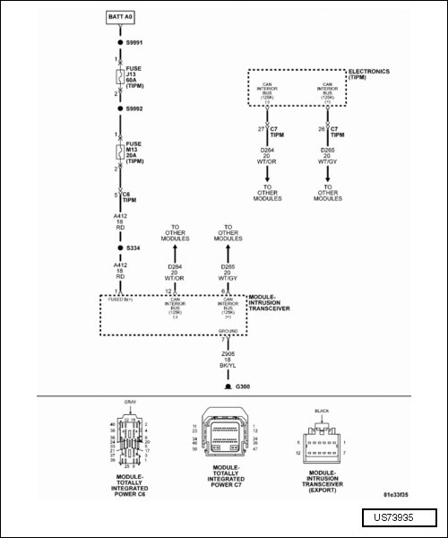 • Measure the resistance of the CAN interior bus (+) 125K circuit between the TIPM C7 harness connector and the intrusion transceiver module harness connector.