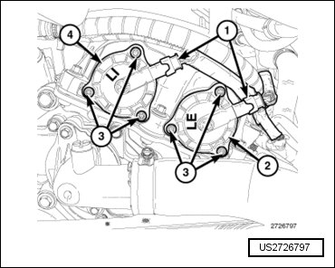 - Mark the intake variable valve timing solenoid (4) and the exhaust variable valve timing solenoid (2) with a paint pen or equivalent so that they may be reinstalled in their original locations.