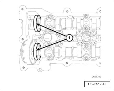 - Remove the oil control valve (2) and pull the right side exhaust cam phaser off of the camshaft.