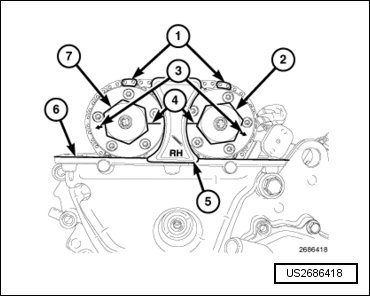 - Install the RH camshaft phaser lock (10202) (5) and tighten the oil control valves (2) and (7) to 150 Nm (110 ft. lbs.).