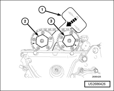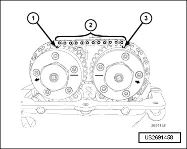 - There should be 12 chain pins (2) between the exhaust cam phaser triangle marking (1) and the intake cam phaser circle marking (3).