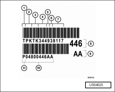 The 62TE transaxle is identified by a barcode label (1) that is fixed to the transaxle case or the "PK" number (2).