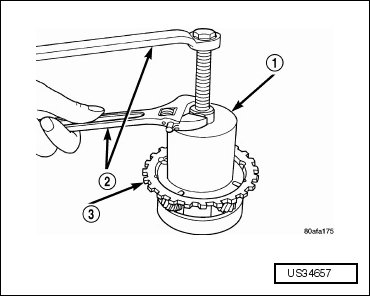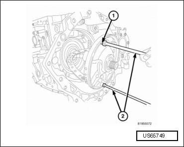 - Remove the oil pump (1) using the oil pump puller (C-3752) (2).