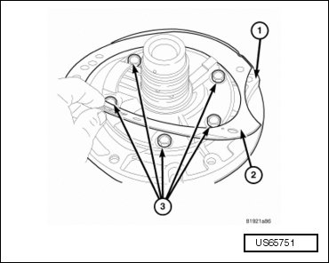 - Remove the front carrier/rear annulus assembly (2) and the number six needle bearing (1).