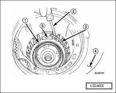 - Remove the 2/4 clutch pack (1 - clutch plates, four each) and (2 - clutch discs, four each). Tag the 2/4 clutch pack for reassembly identification.