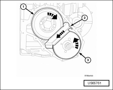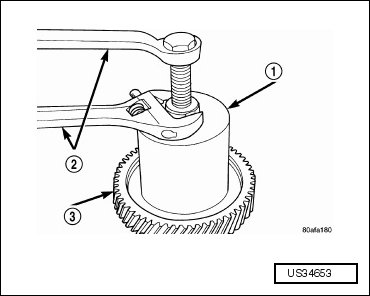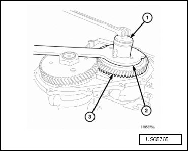 - Bend back the locking tabs (2) on the output transfer gear retaining strap (3).