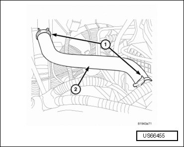 - Install the upper radiator hose (2) and position the clamps (1).