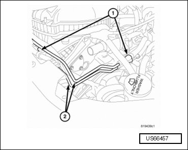 - Remove the bolts (1) securing the power steering lines (2).