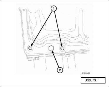 - Remove the pressure tap plug (2) from the valve body oil pan.