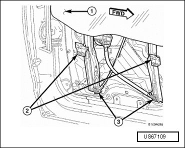 - Working through the close out plug and speaker holes in the carrier plate, carefully disengage the front door glass (1) from the two plastic retainer clips (2) located on the window regulator (3).
