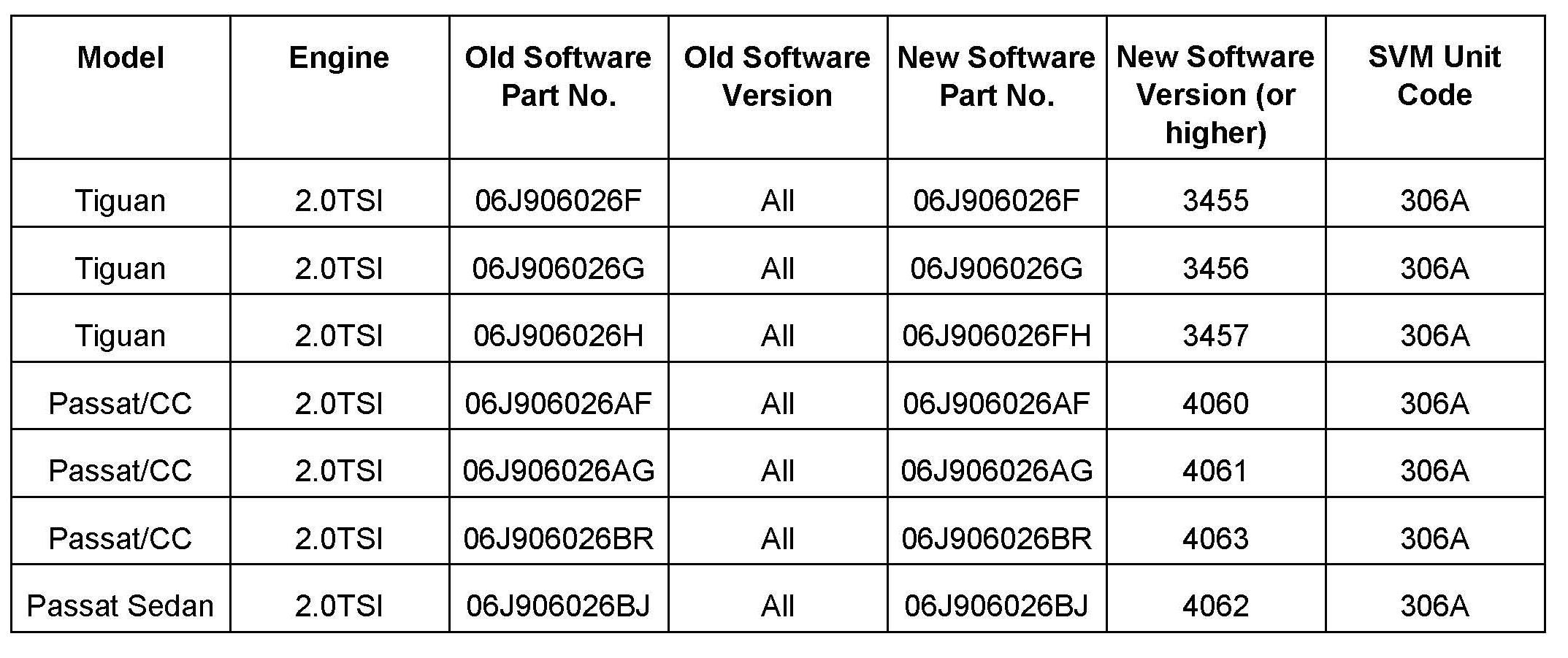 - Update the Engine Control Module using the SVM Unit code as listed in the table shown.