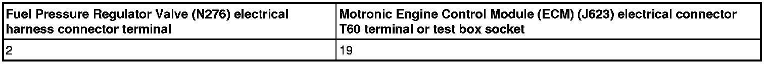 - Using a multimeter, check the Fuel Pressure Regulator Valve (N276)electrical connector terminal 1 to Ground.