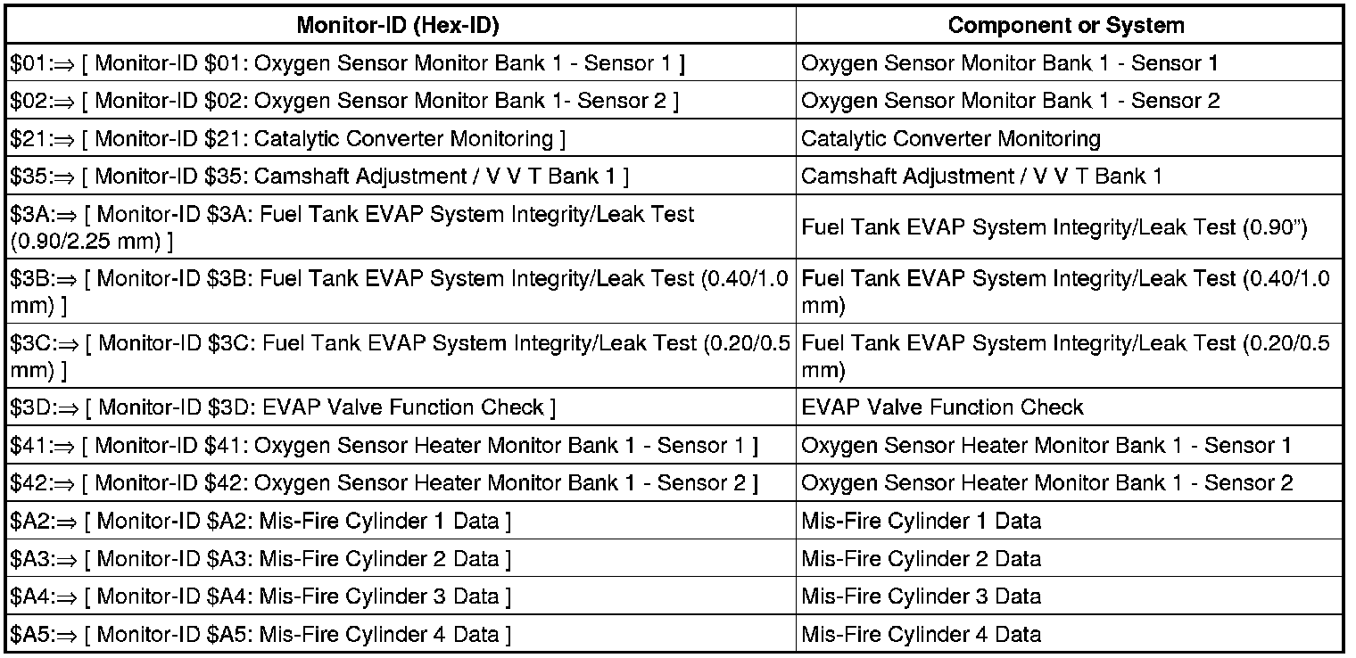 • Depending on scan tool and protocol used, the information in diagnostic mode 01 may be referred to by different names such as Test-ID (TID), Hex-ID, Component-ID (CID), or On-Board Diagnostic Monitor Identifier (OBDMID).