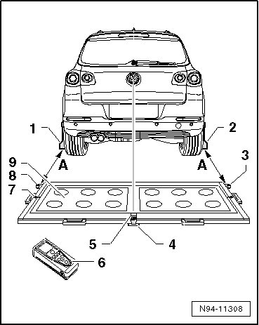 - Position the (VAS 6350/4) behind the vehicle with a distance of 1.2 m to 1.7 m (4 feet to 5.5 feet) between the angled brackets on the calibration device and the paddles at the rear wheel center wheel mounts as shown in the overview illustration - dimension A - => [ (Item 9) ].