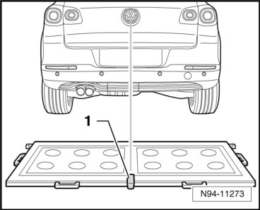- Switch on the laser on the calibration device - 1 - and align the entire calibration device so that laser beam strikes on center of vehicle rear end above the VW logo.