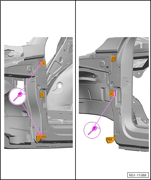 - Weld in A-pillar to the sill panel, gas-shielded arc plug weld seam.