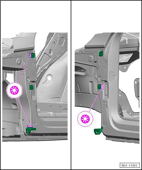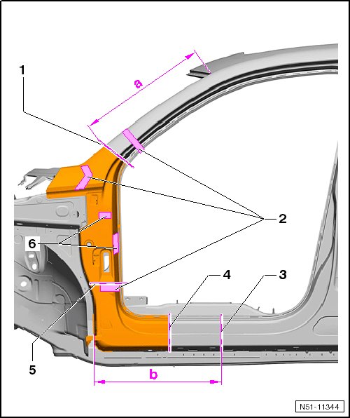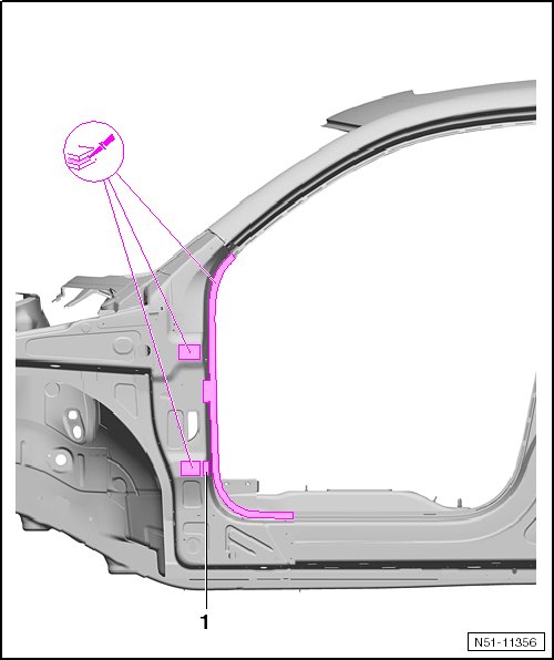 - Weld the A-pillar to the A-pillar reinforcement - 2 -, using a gas-shielded arc plug weld seam.